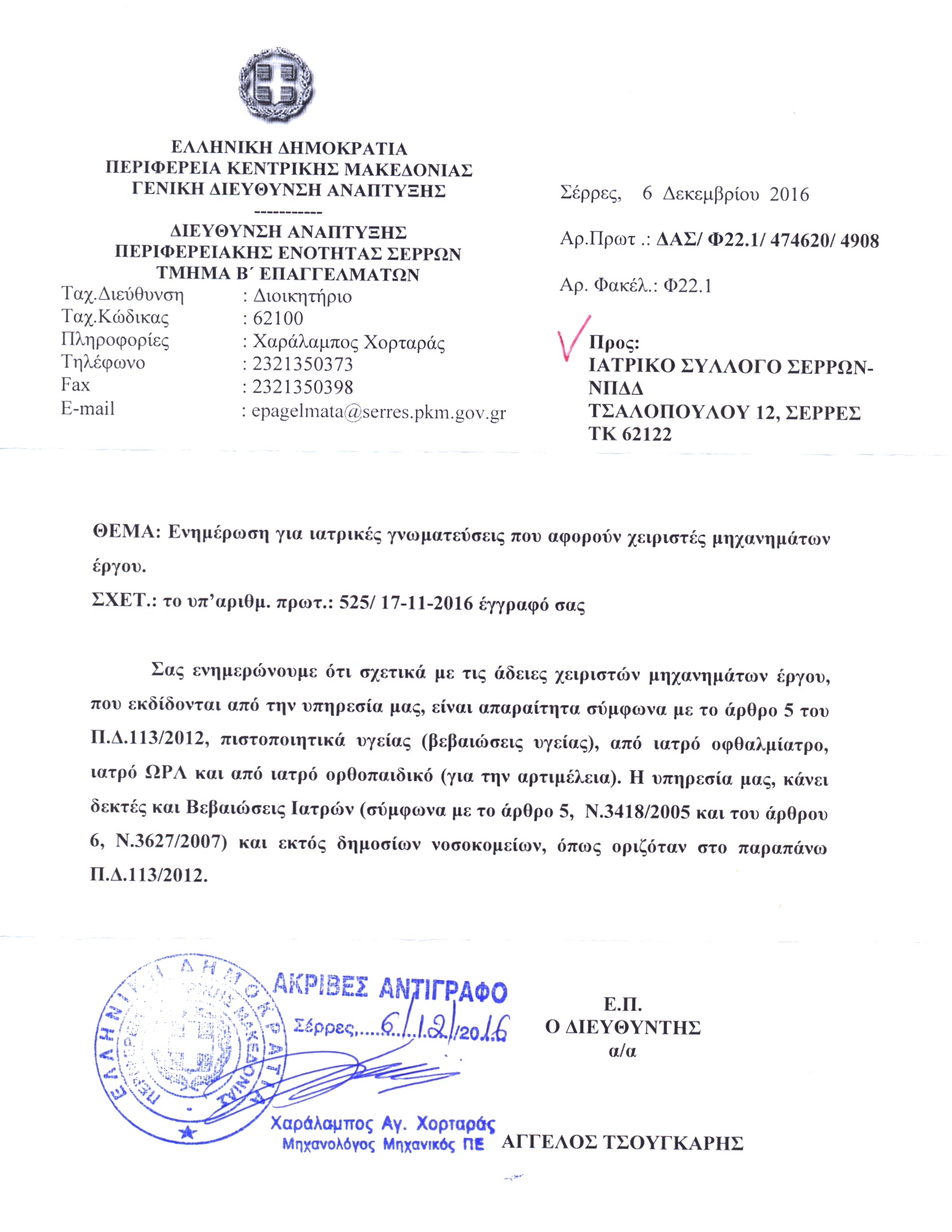 Η Δ/ση Ανάπτυξης (πρώην Βιομηχανίας) δέχεται γνωματεύσεις από Νοσοκομειακούς και Ιδιώτες γιατρούς για τις άδειες χειριστών μηχανημάτων.